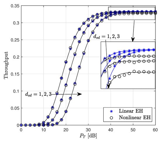 Figure 8 depicts the throughput with respect to for different values of . The target rate is fixed at . The results reveal that, for the distances , the linear EH model provides performance approximately equivalent to that of the non-linear EH since the amount of harvested powers are approximately equal for both EH models. Moreover, in all cases, the throughput reaches its maximum value at dB.