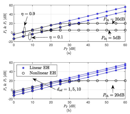 Figure 10 plots the source and relay harvested powers versus . Please note that, from Appendix D, for an equal distance of S and R from PB, and for equal fading channel parameters, the harvested powers and are equal. The curves in Figure 10 are obtained using (A34) and (A35) for linear and non-linear EH models, respectively. As seen from Figure 10a,b, the distance () and energy efficiency () have a significant effect on the amount of powers harvested at S and R. It is observed that, for high values of , the average harvested power in the linear EH model is higher compared to the considered non-linear EH model, which is saturated to a predefined threshold value . This high value is contrary to the amount of harvested energy in practical NL EH models, where it results in an overestimation of system performance.