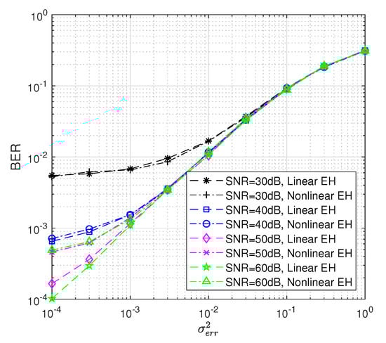 Figure 11 shows the BER performance versus channel estimation error power for different SNR values. Both linear and non-linear EH results are obtained considering dB and . Moreover, we modeled the imperfect CSI case as and , where e denotes the the channel estimation error with distribution , denoting the power of the channel estimation error. It is shown that system performances get worse when the power of channel estimation error increases for both linear and non-linear EH models.