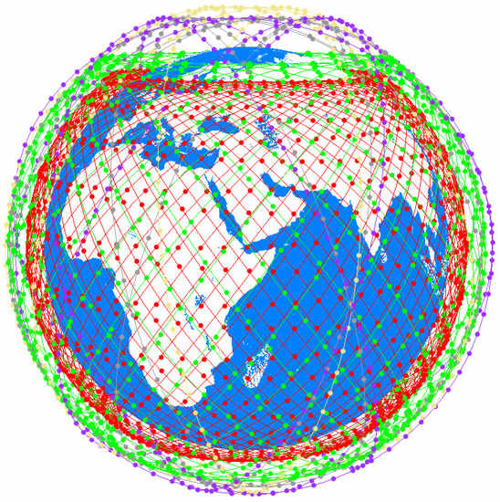 This paper uses the large-scale constellation StarLink as the modeling object. The first phase of the Starlink constellation consists of five Shells [23] defined as , , , , and from near to far from the ground. The number of orbits of each Shell, the number of satellites in each orbit, and the orbital inclination parameters are shown in Table 1. Figure 1 shows the schematic diagram of the StarLink constellation. Each color represents a shell.