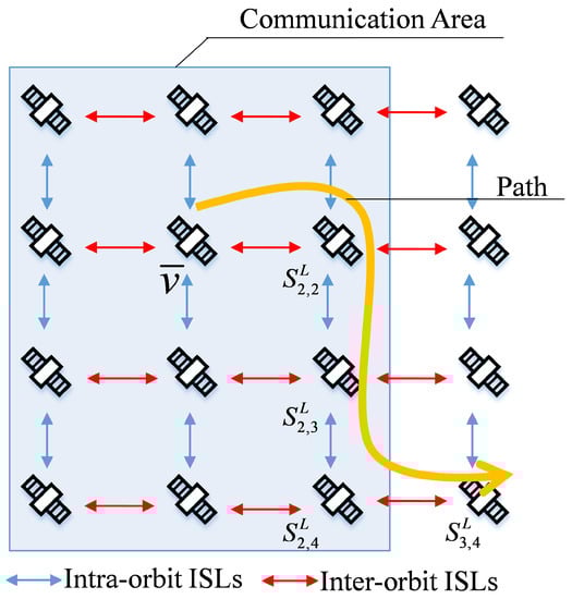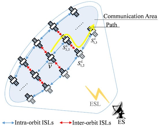 Figure 2 shows the topological relationship between the ES and the satellite network. The shadow area in the figure is the communication domain calculated according to the minimum elevation angle of the ES. Define the set of satellites in the communication domain of the ES as . If , then can establish an ESL with ES. The satellite establishing ESL with ES is defined as . ES sends packets to , and the satellite forwards packets according to the routing table. As the yellow arrow in Figure 2 shows the packet forwarding path, the set of satellites on the path is defined as . The satellite set in the communication domain and belonging to the forwarding path is defined as , namely . In Figure 2, .