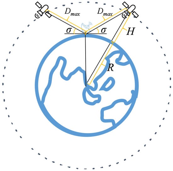 where R is the radius of the Earth, H is the distance from the satellite to the ground, is the minimum elevation of ES, and is a temporary variable. The meaning of parameters in Equation (1) is shown in Figure 3.