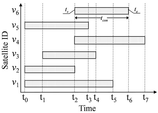 The satellite coverage time in the communication domain of the ES is schematically shown in Figure 4. and are the start and end moments of the coverage time, respectively. Select the access satellite according to Equation (6). If ES is at time , the traffic volume to be transmitted is . When , ES preferentially chooses as the access satellite. When , ES preferentially chooses as the access satellite. When , ES preferentially chooses as the access satellite. The access satellites selected above can theoretically complete data transmission without switching ESLs. However, when is larger than the coverage time of any satellite, it is necessary to switch the access satellite. In this case, how to choose the access satellite set and the access sequence to maximize the value. We will give a strategy to solve this problem in the next section.