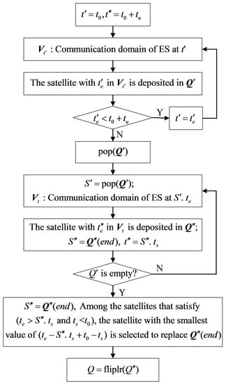 As shown in Figure 4, if the traffic volume transmitted by the ES at time is . When , then . Choosing any satellite cannot complete the data transmission without switching ESL. To solve the access problem for and to achieve the minimum number of switching and maximum value. This paper defines the set of ES’s access satellites at time t as . The satellites are stored in according to the access sequence of ES. The flow chart of calculation is shown in Figure 5.