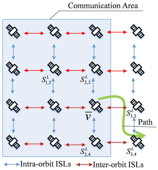 The constellation is defined as an undirected graph , where represents the satellite nodes, defined as , where L denotes the Shell serial number, n denotes the orbit serial number, m denotes the satellite serial number within the orbit, denotes the total number of orbits on shell , denotes the number of satellites per orbit of shell . Table 1 shows that there are satellites in StarLink constellation. represents the set of inter-satellite links (ISLs) and ESLs in the constellation, . Each satellite can establish ISLs with the surrounding satellites [24], and satellites in the communication domain of ES can establish ESLs.