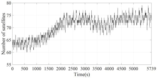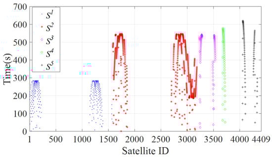 In Figure 4, the access satellite set of the ES at time is calculated according to the above process. When satisfies , the set of access satellites is .