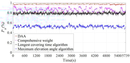 In the scenario without insufficient resources, satellite failures, and ESLs interruption, the relationship between the value and the access time of the DAA algorithm and the traditional access algorithm is shown in Figure 10. The vertical coordinates in the graph indicate the average value of obtained from multiple experiments. The horizontal coordinate indicates the moment when start transmitting packets. The simulation results show that the average values of the DAA algorithm, comprehensive weighting algorithm, longest covering time algorithm, and maximum elevation angle algorithm are 97%, 85%, 79%, and 51%. Therefore, the coverage time of the access satellite selected by the DAA algorithm is the most matched with . The value of the DAA algorithm is the most stable because each access uses the process shown in Figure 5 to select the satellites with the most matching as the access satellites.