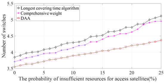 The relationship between the probability of insufficient satellite resources and switching times is shown in Figure 11. The number of switches in the figure is the average of the experimental results obtained from multiple experiments. The vertical coordinate is the sum of the number of switches required by to complete the data transmission. The horizontal coordinates are the probability of insufficient satellite resources. As the maximum elevation angle access algorithm has the minimum value, the switching times are much more than the other three algorithms. Therefore, the experimental results of the switching times of the maximum elevation angle access algorithm are no longer displayed in Figure 11.