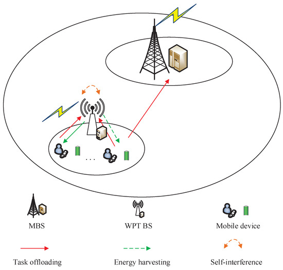 The three-tier WPT MEC system model is shown in Figure 1. The system model consists of multiple MDs, WPT BS, and MBS. The WPT BS transmits energy to the neighboring users in a broadcast mode, and each MD has a wireless energy-harvesting capability, and the harvested energy is stored. The MD is closer to the WPT BS, while the distance to the MBS is relatively long. Throughout this paper, we use , to represent the set of MDs. Each MD i is equipped with an EH battery, and the computing capacity of i is defined as . Furthermore, MDs have full/half-duplex EH modes, and the harvested energy will be stored in the battery. The WPT BS is represented by WPT BS and adopts full-duplex or half-duplex mode to carry out WPT for MDs, and it can also provide computing services with computing capacity . In order to enhance the computing capacity of the system, a server with powerful computing capacity is integrated into MBS, and the computing capacity of the MBS server is represented by . In the three-tier heterogeneous MEC system, MDs are able to choose to perform local computing, either offloading computing tasks to a server at the WPT BS for executing or offloading to a remote MBS server for processing. The uplink between the MD and the WPT BS or MBS employs a wireless connection for the communication and offloading of computation tasks, while in the downlink, the WPT BS and MBS return the processed computation task results to the MD, and since the data size of the computation results is relatively small, hence, we ignore the transmission delay and communication energy consumption of the computation result return in the downlink in this case.