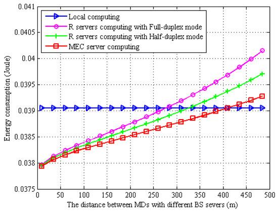 Energy consumption vs. different distance between MDs with BS servers.