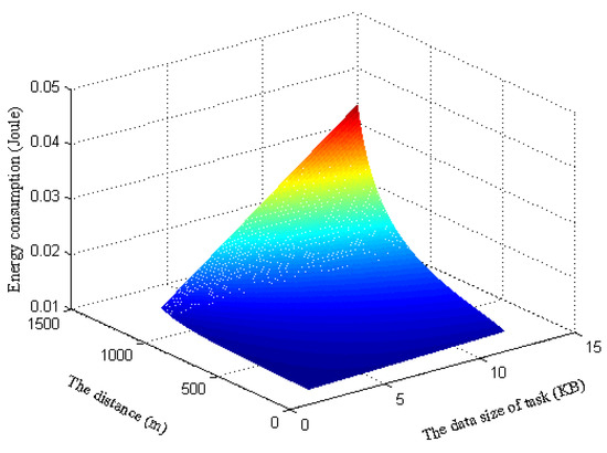 Energy consumption vs. different distances and data sizes of tasks.