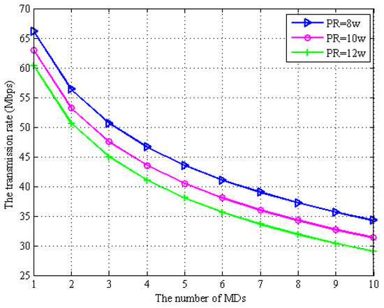 In Figure 5 and Figure 6, we describe the transmission rate of computation task offloading data and the EH by MD regarding the number of MDs in the network system proposed in the paper under the full-duplex EH technique based on the MD. We assume that the transmission power of the WPT BS is . From Figure 5, we can observe that as the number of MDs increases, the task offloading rate between the MDs and the WPT BS decreases subsequently. This is because under the full-duplex EH model, self-interference is easily generated, which increases the interference of computation task offloading in the wireless channel and thus decreases the rate of data transmission. It can be seen from Figure 6 that as the number of MDs increases, the offloading transmission rate decreases, which increases the offloading time. In order to complete the task within the maximum allowed delay, the MDs need to harvest more energy provided by the WPT BS. It can be seen from both Figure 5 and Figure 6 that in order to increase the offloading rate, the transmission power between the MDs and the WPT BS needs to be increased.