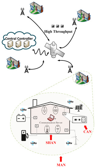 Figure 1 is a conceptual illustration of a combination of different communication systems operating in coordination to manage an MG cluster-based power-system. It consists of several modern farmhouses that can communicate through a satellite type backhaul link due to the wide separation and possible terrain complications between them. They are also electrically inter-connected which is not shown in the figure. By zooming on to an individual farmhouse, which represents a residential MG, it can be understood that distributed-generators (DGs) and loads are required to be managed by central controllers that can be located relatively far away. That long-range requirement can justify the utilization of LoRa, which is a low-power and long-range wireless protocol [13].