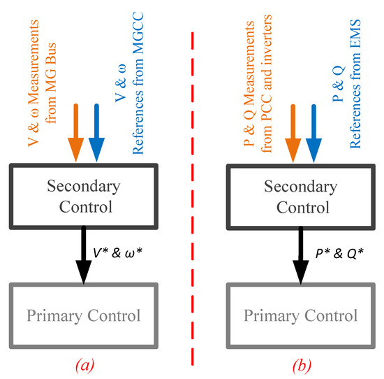 In this paper, we are primarily interested in the MG-level and the details of its link failure effects will be discussed in this section. Based on the configuration of a specific MG the role of communication in the control architecture varies. For example, in an MG architecture based on voltage source inverters (VSIs) the secondary control is the most recognizable point of communication interaction with MG control. This level deals with voltage and frequency deviations caused by the primary control by restoring the reference values. Furthermore, it contributes to proper reactive power sharing since there is a trade-off between voltage regulation and reactive power sharing in the primary level [29,30]. In another grid-connected MG topology, that is formed of grid-feeding inverters, the secondary control functionality is completely different. Figure 2 illustrates the difference between the secondary-level of control for the two aforementioned types of inverter. As it can be observed, when voltage-source and VSIs are used the secondary control inputs are voltage/frequency references and measurements while in the grid-feeding and current source inverters (CSIs) externally generated power references and power measurements are transmitted to the secondary controller. As a result of this argument it can be easily understood that the effects of communication link losses can be quite different depending on which types of inverters are utilized.