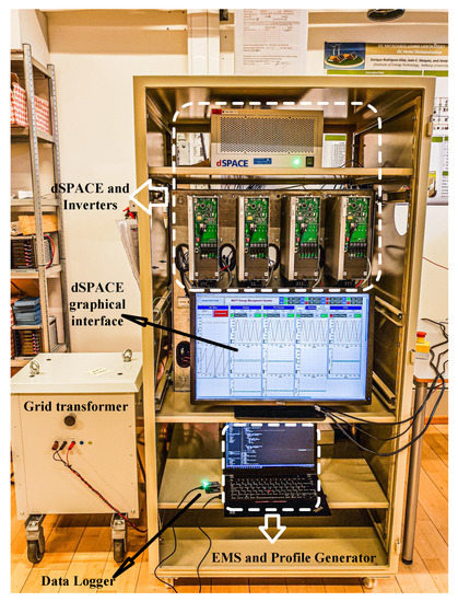 An external EMS that receives the power measurements from the inverters and calculates and transmits proper power references for the ESS is included in our testbed. This EMS is connected to the other devices through a message queuing telemetry transport (MQTT) communication structure that was created by using micro-python enabled microcontrollers [2]. A photo of this experimental tetstbed is provided in Figure 3.