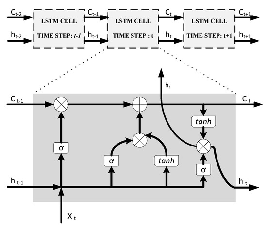 LSTM method was introduced to address these problems and gradually became the dominant RNN method for time-series forecasting [35]. The basic idea of LSTM is that at each time sequence the NN can store and trash some memory data which is performed by using input, output, and forget gates in the algorithm structure [9,35]. An LSTM cell receives the cell state (Ct) and the output value from the previous time step which is also called hidden state (ht). In addition, the cell receives a current input for each time step (xt). The cell output for each timestep are current cell and hidden states, (Ct) and (ht). It is useful to add, LSTM algorithm utilizes three sigmoid and two tanh non-linear activation functions [35]. An illustration of LSTM architecture is provided in Figure 5.