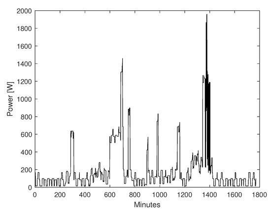 The utilized data for prediction consists of thirty hours of a typical household power consumption generated by utilizing a stochastic model with one minute resolution as illustrated in Figure 6 [36].
