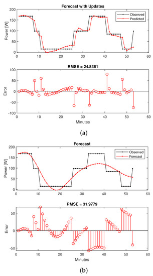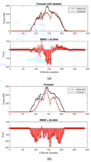 The results are presented in Figure 9, where 200 hidden units and 1000 epoch # were selected as the LSTM-RNN prediction settings. Two different trends are provided that correspond to the two cases of network update with observed values and forecasted values from previous time steps. Similar to the load forecasting test, when the networks is updated with observed values, Figure 9a, the prediction accuracy is much higher, however, this criteria is not suitable for the application of our interest as discussed in the previous section.