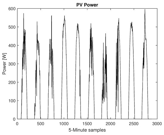 A database of synthetically generated PV-power measures provided by the National Renewable Energy Laboratory (NREL) of the U.S. Department of Energy was used for this simulation [37]. From the database ten days (1 January 2006 to 10 January 2006) of solar generation data corresponding to the state of Alabama were selected with 5 min resolution, Figure 8. The LSTM-RNN was trained for 9 days and predicted PV-power for the following day. It should be noted that solar generation strongly depends on immediate weather conditions and phenomenon which was not considered in this simulation and more complicated algorithms are essential for very-accurate predictions.