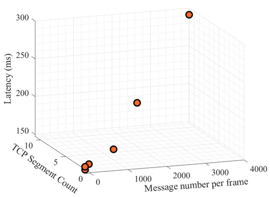 It can be observed from the results that for the cases of less than 1000 messages the latencies remain fairly constant with a value of approximately 150 milliseconds. Beyond this point, the latencies increase since the payloads need to be divided to a number of TCP segments. It should be noted that the maximum size of a TCP segment is limited to 1500 bytes including its IP and TCP headers [42]. The payload sizes and TCP segment counts of the MQTT frames are obtained by using Wireshark which is an open source and widely recognized network protocol analyzer.