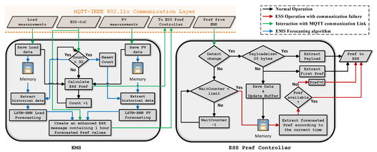 The EMS power-references are directly utilized to generate pulse width modulation signals that coordinate the charge and discharge operations of the ESS. However, prior to this step, there should be another controller that investigates the operational conditions of the communication link and select what type of data (real time or forecasted) should be provided to the converter’s main controller. This is described in the right hand side block (ESS Pref Controller) of Figure 11. As it can be observed, the link health status is first checked by performing a wait loop. If no change is detected in the received Pref (from the EMS) for more than one minute the controller assumes a link-loss has occurred and attempts to use the forecasted values stored in its memory storage. These predicted Prefs were previously stored by recognizing an “enhanced EMS message” (according to its larger size) from a normal message. The main characteristics of the proposed EMS-ESS structure are listed bellow: