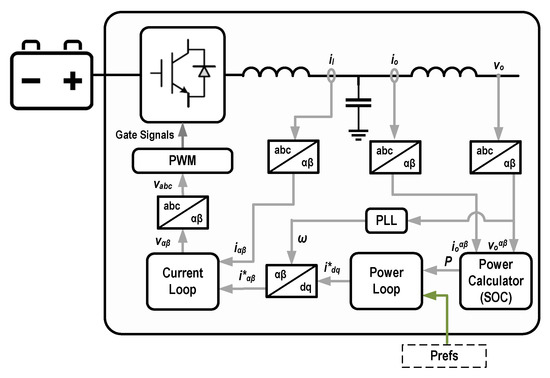 Once these power-references are transmitted from the EMS, they will be received by the ESS while it is subscribing to the same topic in the MQTT communication infrastructure. In MG methodology, ESSs (similar to DGs) are controlled by power-electronics based converters. The experimental testbed configuration used for this research that was explained in Section 3.1 is based on grid-feeding inverters operating in grid-connected mode. In such a configuration, the transmitted power references are required to be consumed by the converter’s controller power loop to regulate the power exchange with the MG bus. This scheme is illustrated in Figure 12.