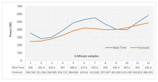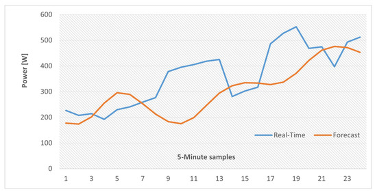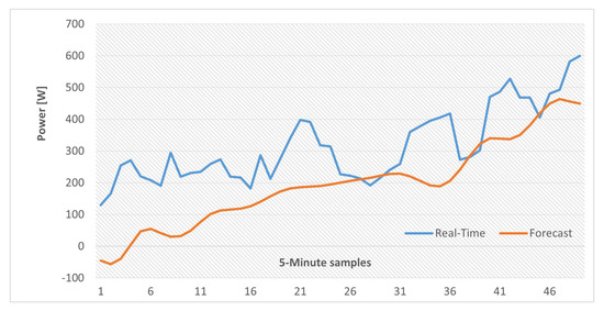 The results are provided in Figure 13. In this selected time horizon, since the PV-generation values are consistently larger than the consumption there is power excess inside the MG which is represented by the black curve in the figure. On the other hand, it can be observed that the forecast curve follows the pattern of the actual values in an acceptable manner. For this time period the total internal energy imbalance inside the MG is (0.4367 kWh) which means if an operational ESS is present in the system, (0.4367 kWh) energy will be stored while using accurate Prefs. This is only possible if an operational communication link between the EMS and ESS exists.