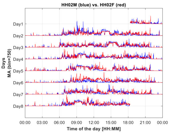 Synchronized plots of the week-long MA profiles of the two subjects (HH02M, male, in blue, and HH02F, woman, in red) belonging to a married couple. The CC value between them is 0.58, the highest value observed in the study, marking a relevant coupling, noticeable in the common wake-up time, frequent phases of common MVPA, and common sleeping time.