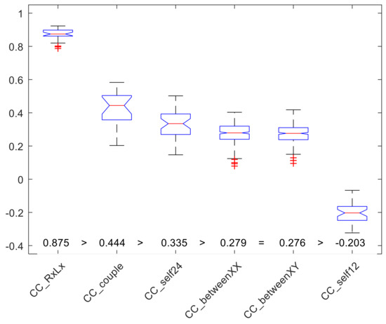 Bar plots of the CC values grouped according to the conditions considered (plotted values include median, reported also as numerical values, first and third quartiles, nonoutlier extremes, and, where present, outliers as “+”). The statistical analysis (Kruskal–Wallis, ANOVA, and Wilcoxon–Mann–Whitney post-hoc tests) evidenced that all conditions have different values compared to the other groups (the only exception is that CCbetweenXX and CCbetweenXY did not show different values). Median values are reported just above the x-axis labels, with significant differences between groups. The CCRxLx group is presented as a reference, derived from a different data set published elsewhere [15].