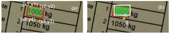 Figure 2 illustrates the text detection process (i.e., the two steps) in more detail. First, one detects the related/relevant boundary box. The boundary box, in this case (see Figure 2), due to the current orientation—which is not zero degrees (i.e., not horizontally oriented)—is rotated towards a horizontal orientation, depending on the current/original text position and orientation. Thus, the “boundary box” is defined as a quad polygon (see Figure 2a) or, eventually, a “to-horizontal-rotated” boundary box (see Figure 2b).