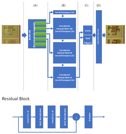 Our detailed architecture for Module 1 indicated in Figure 4. The document detection model contains four parts or sections: (A) Feature extraction using pre-trained ResNet 101; (B) feature fusion layers using concatenation to merge results and process them using residual blocks; (C) output layers, which contain the score values and quad polygons of boundary boxes; and (D) a non-max suppression layer.