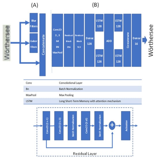 The text recognition model contains three separate parts: The first part comprises the preprocessing layers. The feature extraction preprocessing layers/channels contain different well-known filters, such as blur and Gabor filters (see Figure 11). Compared to the original convolutional recurrent network (CRNN) [41] model, the following changes are introduced: (1) preprocessing layers, (2) introducing residual layers, and (3) replacing LSTM layers with LSTM with attention mechanism. In the first part of model (See Figure 11A) the preprocessing layers and the “Gabor filter” are added. These new preprocessing filters help support the model in focusing on aspects of the input image that are critical and relevant for the classification task. The second part of model (See Figure 11B) uses a residual block of ResNet-like architecture as a set of feature extraction layers. The main reason for choosing this architecture (for the second part) is to provide a deeper network with increasing convergence speed of convergence [47]. Indeed, this enables the network to detect character blocks very easily. The third part of the model contains a feature fusion part. In this part of the model, the extracted information is fused together to provide more sophisticated features. In the last part, we have our output layers, which provide our desired outputs as the final output of the model. Again, to improve the quality of text detection, the LSTM layer is replaced by LSTM with attention mechanism [48]. This proves (as confirmed by our final results) to be very useful and efficient for better text recognition.