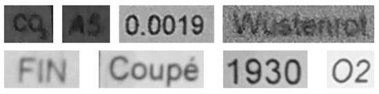 The model introduced in this paper uses convolutional neural networks (CNNs). CNNs are a type of deep neural network that mainly use convolution operations, among others, in their many layers. Deep neural networks (DNNs) are essentially multilayer artificial neural networks [12] composed of four main parts or, rather, functional bricks: convolution layers/filters, subsampling layers/filters, activation functions/layers, and “fully connected” neural network layers/blocks. Convolutional neural networks are essentially well-suited for performing a series of complex processing operations, such as estimating inverse filter(s), classification, denoising, contrast enhancement, text recognition, text detection, etc. Previous studies have indeed proven that this type of network can be used for tasks such as denoising [13,14], contrast enhancement [15], deblurring [16,17], text detection [10,18,19,20,21,22], and text recognition [20,23]. Thus, they have enough potential to reliably perform various types of image processing tasks—especially OCR (see Figure 1).