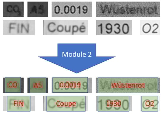 Samples of text recognition inputs obtained by using our Module 1, as shown in Figure 5. The detected text images were cropped from the input image and then used as inputs of the second module to recognize the text information contained therein.
