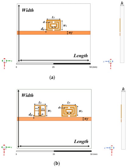 In the frequency domain, a kind of composed of multiple complementary split ring resonators is presented in this paper, which the CSRR resonance unit with the main coupled microstrip line feeds. Its structural layout is shown in Figure 1a. In order to better compare the sensitivity of the proposed CSRR resonant unit to ambient temperature and humidity, an existing reported ELC resonator with good capacitance characteristics is combined in Figure 1b. As shown in Figure 1b, a CSRR resonant unit and an ELC resonant unit are simultaneously set on the main microstrip transmission line in the tag. Figure 1 shows the main parameter dimensions of the tag design. In this work, Rogers 5880 is used as the dielectric substrate and the optimization design is carried out in the radiofrequency (RF) simulation software HFSS. Table 1 shows the specific values of each parameter after tag optimization.
