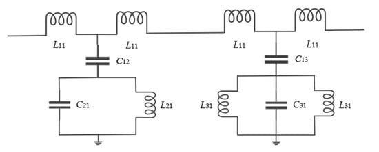 Figure 2 shows the equivalent circuit of the CSRR and ELC resonators coupled simultaneously on the microstrip line. The L11 represents the equivalent inductance on the main transmission line. The greater the value of L11, the greater the loss of signal, which means that the narrower the microstrip line, the greater the attenuation of the signal. C11 and C12 represent the degree of coupling between the microstrip line and the CSRR and ELC resonators, respectively. The smaller the gap between the resonator and the microstrip line, the greater the degree of coupling, and the greater the return loss obtained at the resonant frequency. The bandstop resonance characteristics of the resonator can be modeled with lumped-circuit elements, where the L21, C21 equivalent elements are used to generate the resonant frequency of the CSRR resonator, and the L31, C31 equivalent elements are used to generate the resonant frequency of the ELC resonator. The simplified circuit model of the ELC unit resonant frequency and the CSRR unit resonant frequency is . Where the equivalent inductance and capacitance of CSRR can be derived as follows [25,26,27]: