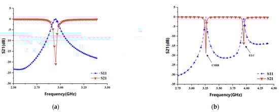 Figure 3a shows the scattering characteristic curve of a single CSRR and the coupling structure when the distance dg1 of the microstrip transmission line is 0.1 mm. When the length L1 of CSRR is 9.6 mm, one of the better bandstop resonance curves is formed at 2.95 GHz, the transmission coefficient S21 is about −21 dB and the reflection coefficient S11 is about 0 dB. Figure 3b shows the S11 and S21 parameter response curves of a single CSRR and a single ELC coupled with the main microstrip transmission line at the same time, where the resonant frequency generated by CSRR is about 3.26 GHz, and that generated by ELC is about 3.95 GHz. The resonant bandwidth of CSRR is about 5 MHz, which is less than the 9 MHz bandwidth of ELC, so the notch curve is more compact. Moreover, CSRR has lower resonant frequency and higher return loss than the ELC resonator when the size difference between the two is not much.