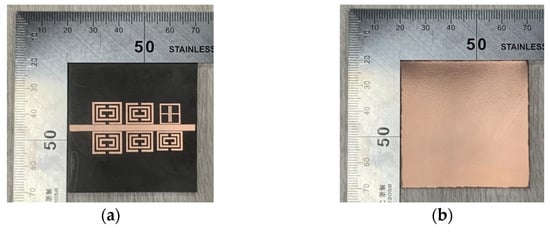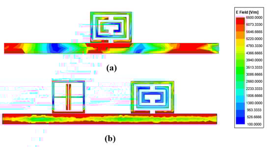Figure 4 compares the surface electric field distribution of the ELC resonator and CSRR resonator at operating frequencies. Figure 4a shows the surface voltage distribution at a single CSRR operating frequency. In the CSRR structure, due to the setup of the multiple split ring and each division characteristic of the microstrip ring stopping the current through the loop, both sides inside the CSRR resonant unit can create two equal capacitors. Figure 4b shows the surface electric field distribution at their respective operating frequencies when the CSRR resonant element and ELC resonant element are coupled with a microstrip line at the same time. It can be seen from the electric field distribution that the electric field of the ELC is mainly concentrated in the capacitor plate accessories, while the electric field of CSRR is mainly concentrated among multiple capacitor plates inside the resonator.