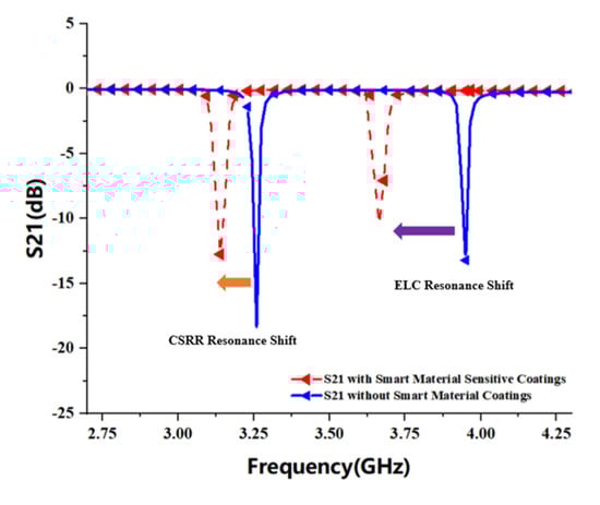Smart polymer materials are very sensitive to physical parameters in the environment; thus, selecting appropriate smart polymer materials combined with the frequency-shifting properties of the chipless RFID sensors can be used to analyze the behavior of the physical parameter changes in various environments. Figure 5 simulates the shift in the resonant frequency of the sensor that may be caused by changes in temperature and humidity in the environment when the resonator surface is coated with a sensitive polymer material, the analysis shows that the proposed ELC resonator has more obvious advantages over the sensitive shift characteristic of the CSRR resonator, but the size of the microstrip line of the ELC resonator is smaller and the resulting resonance frequency is higher. However, the CSRR resonator can achieve a larger size microstrip line in the same physical area than the ELC resonator, so it can generate a lower resonant frequency, and because the CSRR resonator has higher Q values and narrower impedance bandwidth, so more resonant frequencies can be set on the same frequency band, which effectively improves the utilization rate of the corresponding working frequency band. Therefore, combined with the respective advantages of the ELC and CSRR resonators, this paper designs a hybrid resonator RFID tag based on microstrip coupling, which can realize multiple sensing functions in a compact bandwidth.