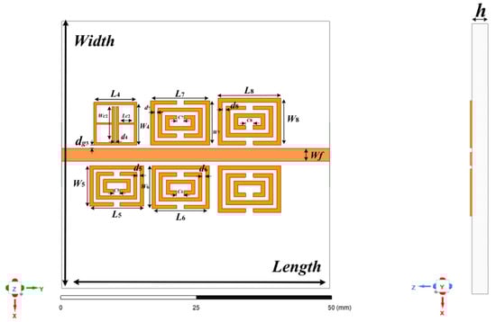 CSRR structure is a common structure used to characterize the characteristics of parameter sensing. However, the research on the application of the CSRR resonator based on microstrip coupling in temperature and humidity sensing is not sufficient at present, and the analysis of its sensitive characteristics and the design of multi-functional integration are very few. Therefore, this paper proposes a 6-bit chipless RFID multi-parameter sensor. The sensor is based on the CSRR resonator and microstrip line coupling layout. To achieve multiple functions in a compact bandwidth, multiple CSRR resonators are set in the tag, and the existing ELC resonator is set as a reference and comparison. As shown in Figure 6, the tag structure and main parameter dimensions are designed in this paper, in which the metal thin layer is used as the radiation sheet and the metal layer on the surface is attached to the dielectric substrate. In addition, Rogers 5880 (relative permittivity εr = 2.2, h = 0.79 mm, tan δ = 0.0009), which has a low dielectric constant, was used as the substrate in the design of the resonator to improve the effect of the sensitive coating.