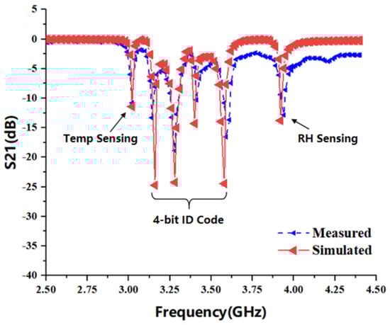 Figure 7 shows the S21 resonance response curve obtained by optimizing the design of a multi-parameter sensor in the RF simulation software HFSS, and the main parameter dimensions of the optimized tag structure are provided in Table 2. The sensor generates a total of six resonant frequencies in a small frequency band, among which five lower resonant frequencies are generated by the CSRR resonant unit, which are 3.03 GHz, 3.14 GHz, 3.28 GHz, 3.41 GHz and 3.61 GHz, respectively, and the ELC resonant unit is set at the highest 3.96 GHz. The working bandwidth of more than 110 MHz is reserved between each resonant unit. The CSRR resonator with the lowest resonance frequency placed in the reverse position is selected as the temperature and humidity sensor, and the remaining four CSRR resonant units are used for the information coding of the tag. Each CSRR bandstop resonator corresponds to a resonant frequency in the spectrum, and the resonant frequency corresponds to a logical “1” state of the encoding bit. When there is no bandstop filtering in the corresponding frequency band, the encoding bit logic turns to “0” state, so the tag can generate 4-bit binary coding and 16 kinds of identity information. Figure 8 shows the actual image of the proposed tag antenna fabricated on the Rogers 5880 dielectric substrate using thermal transfer technology under laboratory conditions, and the tag S21 response curve measured by a vector network analyzer (SYSJOINT SV4401A) is shown in Figure 8.