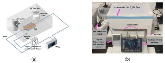 In order to analyze the humidity sensitivity of the tag, this work used the PVA colloidal film and transferred it to the resonance unit of the sensor with a small amount of adhesive, and simulated the change in environmental relative humidity in the closed climate box as shown in Figure 9a. The tag is connected to the vector network analyzer (VNA) through two low-loss RF cables running through the box, and an adjustable humidifier is placed in the airtight box. In order to ensure the uniform change in humidity, a plate of anhydrous CaCl2 hygroscopic agent is also installed in the box to balance the rising trend of humidity, and a high-precision probe-type electronic temperature and humidity instrument is used to monitor the change in humidity in the box in real time. Figure 9b shows the actual humidity test scenario, the gap of the box was completely closed with tape (3M) and tissues, the initial temperature is 24.6 °C and the initial humidity is 27%. Considering that the relative humidity in the actual environment generally ranges from 30% to 90%, the relative humidity test starts from 30%, and the prepared PVA film is pasted on the ELC and CSRR resonant units, respectively.