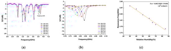 The shifts of all resonant frequencies can be observed as a whole from Figure 10a, and the shifts of the ELC resonant units are partially enlarged in Figure 10b, from the initial 3.8814 GHz to 3.7714 GHz, the resonant frequency is reduced by about 110 MHz, and the change in the resonance curve is more obvious in the high humidity range where the relative humidity is greater than 70%. As shown in Figure 10c, the humidity sensitivity of the ELC resonator is about 2.18 MHz/RH by linearly normalizing the humidity sensing characteristics of the ELC resonator, and the experiments show the best linearity in the range of 30–60%RH, so the optimum resonant frequency range corresponding to the humidity sensitivity is about 3.817–3.881 GHz.