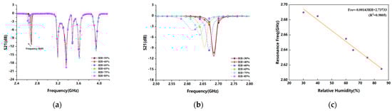 Figure 11 shows the frequency shift of the CSRR resonant unit with the increasing relative humidity in the environment. After placing PVA gel film on the surface of the CSRR resonator, it is also put into the sealed box and put in a static position for two days. From Figure 11a, we can observe the overall shift of all resonant frequencies. In Figure 11b, the resonance frequency shift effect is partially amplified and the selected frequency band is quantified as the humidity sensing region, which is shifted from the initial 2.69 GHz to the 2.615 GHz and the frequency reduced by 75 MHz. When the humidity increases, the increase in water accumulation on the surface of the tag will have a certain impact on the coupled resonant unit. It can be seen from the analysis that the resonant frequency shift is relatively uniform with the increase in humidity, but the resonance effect of the bandstop characteristic in the high humidity area is obviously reduced. When the PVA film absorbs enough water, the penetration depth and shift effect of the resonant frequency will increase, and the notch depth will become significantly shallower under high humidity, which is no longer easy to capture. The reason is that as the relative humidity of the environment increases, the relative permittivity of the coating changes and the transfer efficiency increases. Secondly, the thickness of the coating will increase to a certain extent when it absorbs water in a humid environment, which is also related to the thickness of the film preparation.