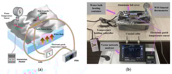 In order to more accurately simulate the temperature changes in the actual environment, this experiment places an intrusive heater in the high-temperature-resistant water tank, and the heating temperature of the heater’s water bath can be adjusted intelligently. Wrap a layer of aluminum foil with good thermal conductivity on the surface of the water tank, fix the tag on the aluminum foil with high-temperature-resistant tape (3M company, Saint Paul, MN, United States) and make the surface fully fit. The thickness of the aluminum foil is 9 μm and the two ports of the tag are wired to measure through an RF cable to reduce external interference.