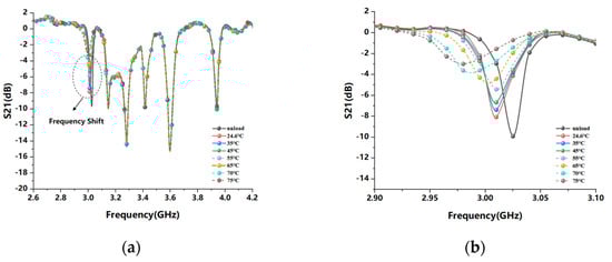 CSRR temperature sensing unit resonance response: (a) S21 resonance response curve change of tag sensor; (b) Partial amplification CSRR resonance unit S21 curve change.