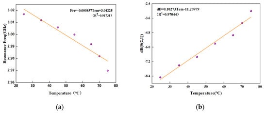 Figure 13 shows the relationship between the frequency response of the CSRR temperature sensing resonance unit S21 and the temperature change when the water bath is heated. The composite film of rGO and PVA was attached to the surface gap of the CSRR resonator by a small amount of adhesive, the tag was completely attached to the thermally conductive aluminum foil and both ends of the tag were connected to a vector network analyzer (SYSJOINT SV4401A). The water bath temperature was increased from room temperature 24.6 °C to 65 °C in 10 °C increments and from 65 °C to 75 °C in 5 °C increments, and the water bath temperature was held at each temperature for approximately 1–2 h with each temperature increment, a certain settling time is reserved for the tag on the aluminum foil to reach equilibrium with the temperature of the water bath, and the VNA records the data. From Figure 13a, we can observe the shift of all the resonant frequencies of the tag under the temperature change. In Figure 13b, the frequency shift effect of CSRR is partially magnified. The resonance frequency of S21 is about 3.03 GHz before the polymer film is not covered, and 3.017 GHz at room temperature after covering, which is reduced by 23 MHz. As the temperature increases, the resonant frequency shifts from the initial 3.017 GHz to 2.97 GHz, and the frequency shift reaches 47 MHz. The analysis shows that with the increase in temperature, the resonant frequency gradually decreases, and the return loss of the temperature sensor S21 also decreases continuously. As shown in Figure 14, through the linear normalization fitting of the sensing characteristics of the CSRR resonator unit in the temperature range of 24.6 °C to 75 °C, Figure 14a shows that the sensitivity of the resonant frequency of the CSRR resonator with temperature change is about 898.63 KHz/°C and Figure 14b shows that the sensitivity of the resonant frequency amplitude of the CSRR resonator with temperature change is about 0.10273 dB/°C. When the CSRR resonant unit is used for temperature sensing, the frequency shift characteristics of the resonance and the change in the depth of peak resonance have a good linearity in the measured range. Therefore, the change in temperature can be reflected from two dimensions, and the experiments show that it has the best linearity in the range of 30–45 °C, so the optimum resonant frequency range corresponding to the temperature sensitivity is about 3.003–3.016 GHz.