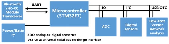 In Figure 16, a simple dynamic tag spectrum detection experiment scenario is set up, in which passive RFID tags are connected to VNA through RF cable, MCU communicates with low-cost VNA as the master controller and tag-scattering parameters in VNA are collected by personal computer (PC) instructions. The interaction between the MCU and the small VNA can be realized through the USB protocol. In this work, the USB OTG interface is used to connect the master and slave devices. The USB OTG interface standard allows a device to act as both a host and a slave, thus enabling bidirectional data transfer between devices. When the MCU is used as the main control device, it can realize the real-time collection of the communication device class (CDC) data of the VNA in the form of a virtual serial port and can realize the data reading of the digital electronic sensor through the inter-integrated circuit (I2C) bus. The scattering parameters are transmitted to PC in the plural form by MCU onboard Bluetooth communication module (HC-05). At the same time, MCU has multiple input/output (IO) interfaces and can be connected to a variety of digital sensors. The MCU in Figure 16 is connected with a highly sensitive temperature and humidity electronic sensor (DHT11) probe. The electronic sensor probe can be deployed in an airtight box to monitor temperature and humidity changes in the box in real time, which is convenient for comparison with tag test data. All data can be sent to PC for data processing and dynamic display through the Bluetooth module, and the users can select the different devices to collect the data by issuing instructions from the PC. In addition, by setting the clock module, the data can be collected regularly, which reduces the power consumption of the detection devices.