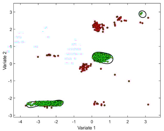 Illustration of two variates classified by SVDD boundaries (in black curves). Green points are inliers and red points are outliers.