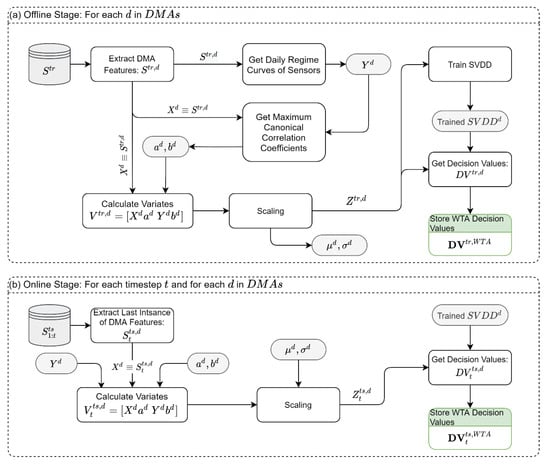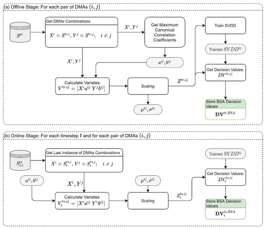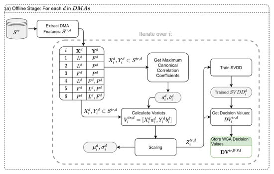 In the following sections, we present the offline stage in which the variates of the MCCA are derived and used to train the SVDD classifiers based on historical data. The offline stage is followed by an online stage where the variates are used in the classifiers to predict the system state. Finally, in Section 2.9, we show how we can synthesize the different classifiers’ predictions to identify the anomalous behavior of the system.